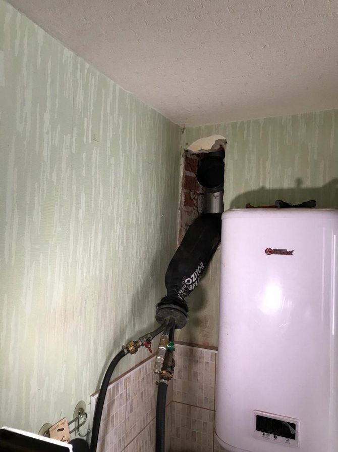 Le tuyau de ventilation ondulé de la marque de capot de ventilation, de 75 mm de diamètre, est relié au tuyau de sortie sur le corps du réservoir avec l'absorbeur. Pour l'élimination complète des fumées, plusieurs conditions d'installation doivent être remplies: