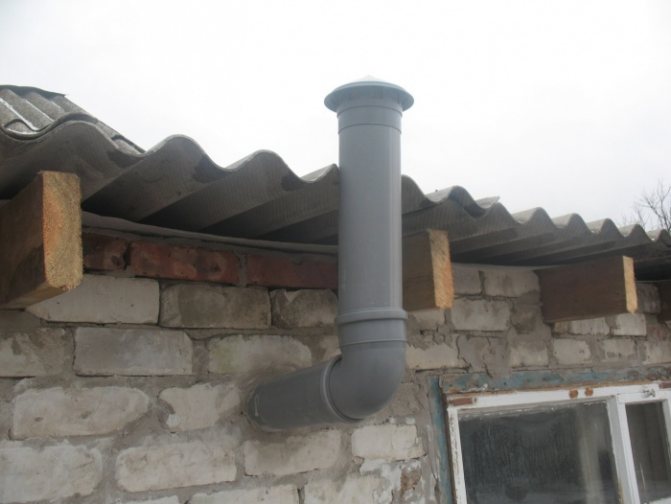 Le tuyau d'alimentation doit être abaissé à environ 0,4-0,5 m du sol, tandis que le tuyau d'échappement doit être descendu à 1,5-2 m. Le conduit d'échappement doit mesurer plus de 2,5 m de long afin d'assurer une différence de température suffisante pour faciliter le mouvement air. Un déflecteur spécial est installé sur sa partie supérieure, dominant le toit. Il protégera parfaitement le sous-sol de la poussière et des précipitations, et se chargera également d'une extraction plus efficace.