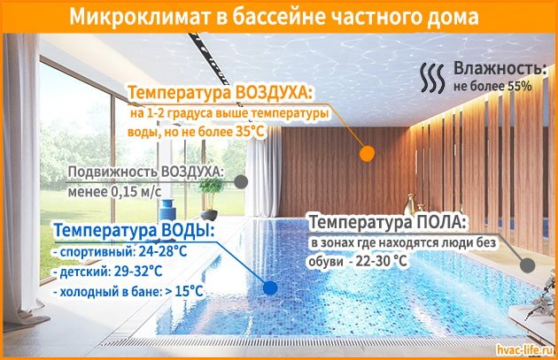 L'essentiel dans l'organisation de la ventilation dans un réservoir privé (des exemples de calcul de la ventilation d'une piscine dans une maison privée ou un chalet sont juste en dessous) est de faire en sorte qu'une personne soit à l'aise d'être nue.