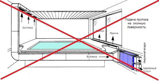 • Il est impossible de percer des trous d'une taille telle que la vitesse de l'air à partir de ceux-ci soit inférieure à 0,5 m / s, et à une vitesse plus élevée, il y aura des courants d'air et une gêne sur lesquels repose le bol. Assez problématique • Dans la zone de la fenêtre, il y a des convecteurs de chauffage et des tuyaux. Vous devrez commander des convecteurs sur mesure, ce qui est long et coûteux.
