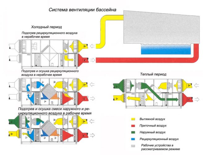 En hiver, l'air extérieur est froid, mais très sec, il en faut donc très peu pour vider la piscine - 7 fois moins qu'en été. Il ne reste plus qu'à chauffer. De ce fait, le volume d'air pour la vidange de la piscine en hiver est très faible, de 350 à 500 m3 / h, et un minimum de 1500 m3 / h est nécessaire pour la récupération du récupérateur.