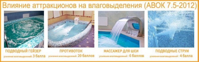 La quantité d'humidité en excès dépend de la région de construction, de la présence d'un déshumidificateur, de la surface du bol (surface de la surface de l'eau), du coefficient de taux d'évaporation (Δßb). Les manèges ont un impact important sur la consommation d'air: toboggans, contre-courant, masseur, jets sous-marins, fontaines et geysers.