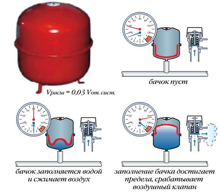 Le vase d'expansion doit être installé dans la partie supérieure du système: il remplira la fonction de réception de vapeur et de chaleur excessive - cela est nécessaire en raison de la propriété de l'eau de se dilater lorsqu'elle est chauffée et de passer à l'état de vapeur. Le réservoir doit avoir un robinet de vidange et un bouchon ou une valve en haut. Une fois que l'eau est chauffée, elle est distribuée par le tuyau d'alimentation vers les colonnes montantes et les radiateurs.