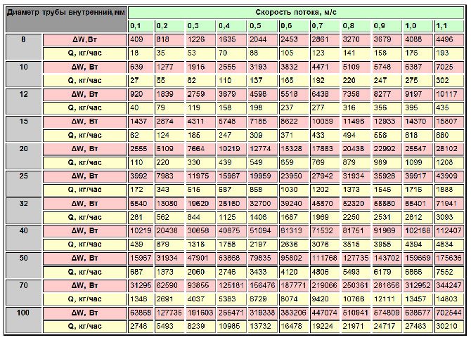 Les principaux paramètres des systèmes de chauffage et d'alimentation en eau, en fonction des matériaux pour les tuyaux sélectionnés: