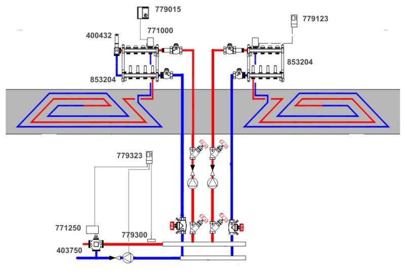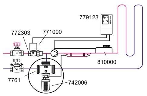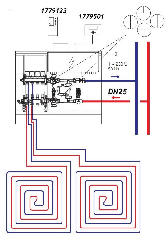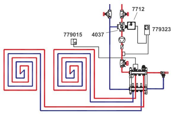 montre un sol chaud composé d'un, mais grand contour. La pompe entraîne l'eau du circuit. Une vanne thermostatique est installée sur l'alimentation du plancher chaud, qui est contrôlée par le variateur par un régulateur de température électronique 1779015 ou 1779123.