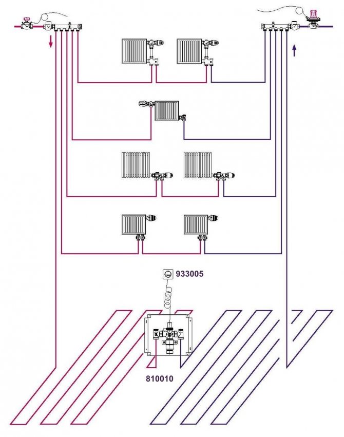 l'entrée d'une source de chaleur est représentée, il s'agit soit d'une chaufferie, soit d'un échangeur de chaleur, soit d'un ITP ou d'une station de chauffage central. Un tas de vanne trois voies Herz 4037 + actionneur 771250 - régulateur 779323 vous permet de limiter la température du liquide de refroidissement entrant dans le plancher chaud, par exemple, à 50 ° C. De plus, l'eau chaude pénètre soit dans le collecteur commun du sol chaud (