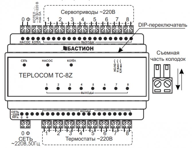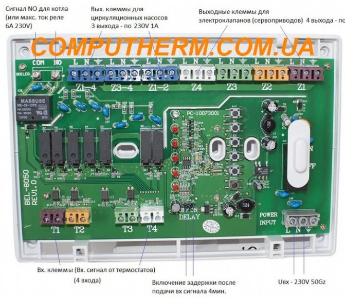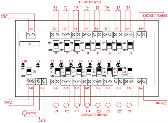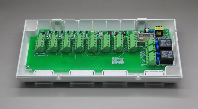 Cet appareil est clairement plus qu'une boîte à bornes. Le communicateur peut réguler la température du fluide de chauffage d'alimentation du chauffage par le sol, en fonction de la température de l'air extérieur, ainsi que contrôler et exclure sa surchauffe au-dessus de 55 ° C, en ajustant le servo du mitigeur à l'aide d'un capteur de température d'air extérieur supplémentaire.