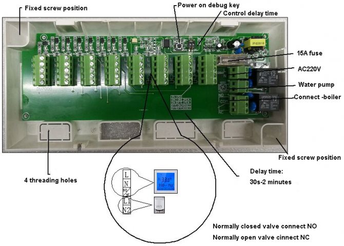 Je ne comprends pas pourquoi cela est fait et pourquoi ne pas simplement faire ressortir les contacts de relais - ce serait une manière universelle. Bien que, d'un autre côté, l'installation soit plus pratique sans cavaliers inutiles dans le boîtier d'installation - le fil 220V entrant et le fil sortant vers le sol chaud reposent sur les bornes correspondantes sans connexions supplémentaires. Deux contacts supplémentaires sur le thermostat aideraient ici afin que vous puissiez retirer ou mettre un cavalier.