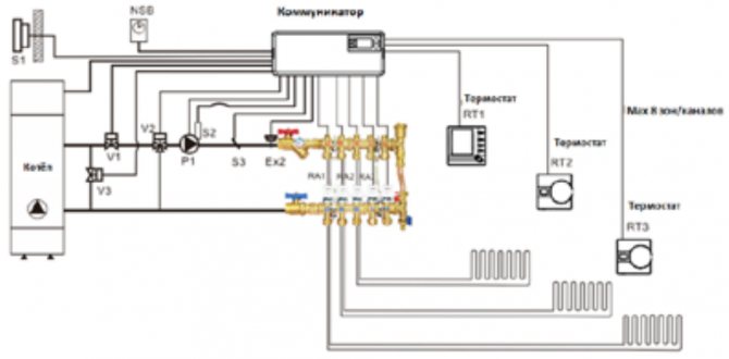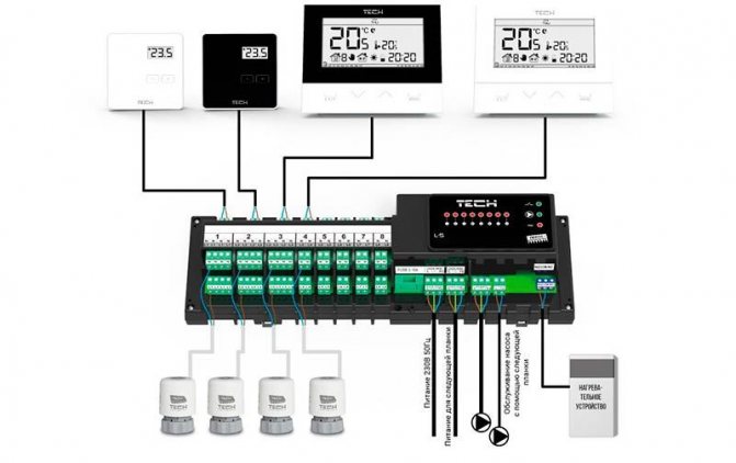 Une unité de commande centrale pour le chauffage par le sol est nécessaire, qui, sur la base des signaux reçus des thermostats, démarrera la chaudière et la pompe de l'unité de mélange.