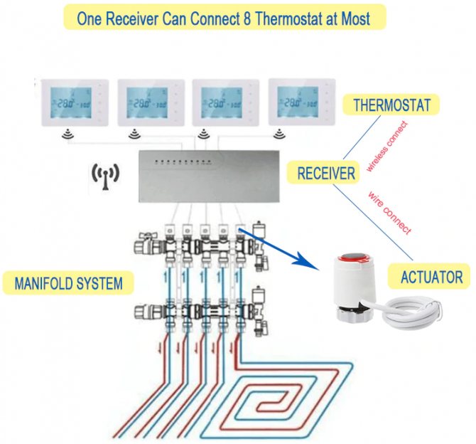 Pour contrôler le chauffage par le sol à eau, un thermostat d'ambiance est installé dans chaque pièce, qui contrôle la tête directionnelle motorisée électrique correspondante sur le capteur de chauffage par le sol.
