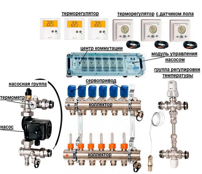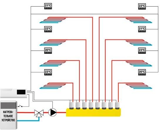 Si le chauffage par le sol est équipé d'une seule pompe et d'une seule unité de commande, le chauffage sera maintenu au même niveau dans toutes les pièces. Le système s'éteindra non seulement dans une pièce où la température dépasse la norme, mais également dans une pièce avec un indicateur plus réduit. L'automatisation du chauffage par le sol qui contrôle le fonctionnement de la pompe est représentée par les éléments suivants: