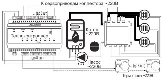La vanne thermostatique à trois voies pour le chauffage par le sol est raccordée devant le collecteur. Un certain mode de chauffage de température est réglé sur le capteur. L'appareil commence à fonctionner lorsque les paramètres sont modifiés.
