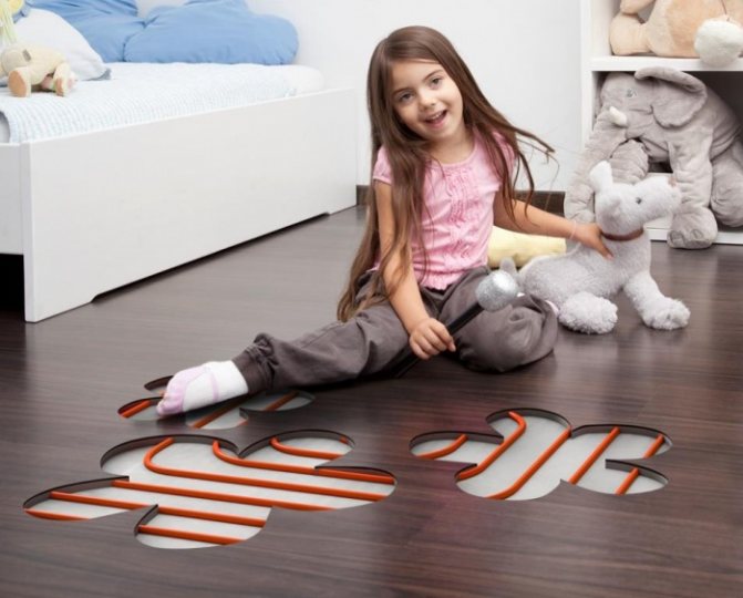 L'aire de jeux dans la chambre des enfants ou le sol près du lit dans la chambre peut être chauffée avec un câble chauffant. Une particularité du conducteur est l'absence de manchon pour relier les conducteurs chauffants et la présence d'une tige de drainage. Les veines sont une seule unité. Pour une pièce séparée, choisissez une section de câble d'une certaine longueur et puissance.