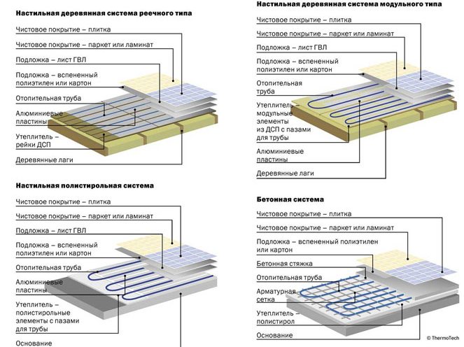 Le revêtement de sol peut être de texture dure ou douce: de la pierre naturelle au tapis. Le système fonctionne sur un réseau électrique de 220 W. Vous pouvez l'acheter chez les revendeurs Rehau à Moscou.