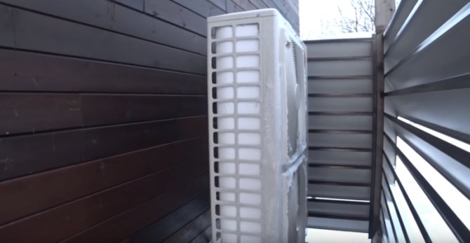 L'unité extérieure de la pompe à chaleur est située derrière les volets transparents à l'air. Il est assez grand et ressemble à un climatiseur industriel. En hiver, le corps de la pompe gèle et est recouvert d'une couche de neige dense. Il s'agit d'un processus prévu dans son travail - selon ses algorithmes internes, l'équipement se dégivre régulièrement et se dégèle complètement. Après cela, tout est répété.