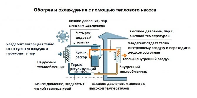 Le principe général de fonctionnement de la pompe à chaleur est à bien des égards similaire à celui utilisé dans le climatiseur, en mode «chauffage ambiant», à la seule différence. La pompe à chaleur est "affûtée" pour le chauffage et le climatiseur pour le refroidissement des pièces. L'énergie de l'air de faible qualité est utilisée pendant le fonctionnement. En conséquence, la consommation d'énergie a été réduite de plus de 3 fois.