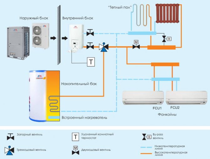 Le principe de fonctionnement d'une pompe à chaleur air-air et son efficacité sont directement liés à la température ambiante. Plus il fait froid «hors de la fenêtre», plus la productivité de la station est faible. Le fonctionnement de la pompe à chaleur air-air à une température de moins -25 ° C (dans la plupart des modèles) s'arrête complètement. Pour compenser le manque de chaleur, une chaudière d'appoint est installée. Utilisation simultanée optimale d'un élément chauffant électrique.
