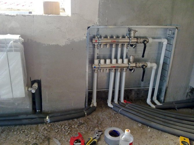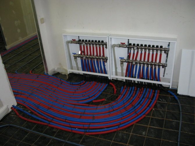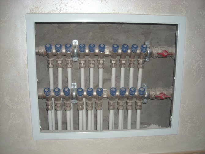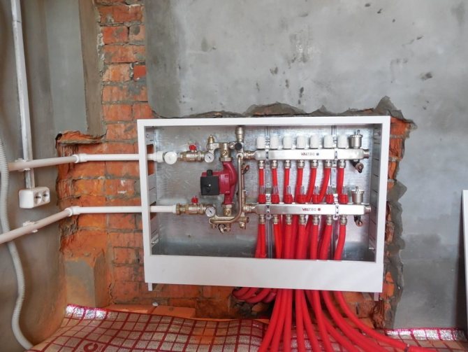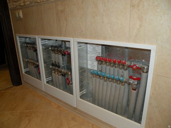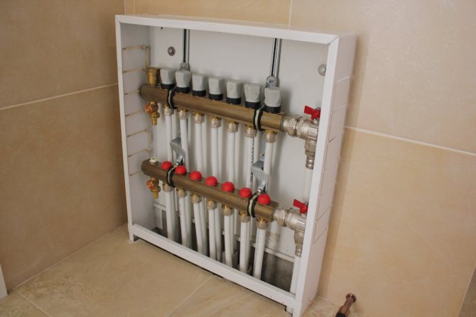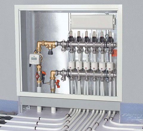 Comparé à la tuyauterie à faire soi-même, le câblage du collecteur est beaucoup plus efficace et pratique, et il est très esthétique dans une armoire spéciale. L'armoire de distribution pour le chauffage peut accueillir à la fois un compteur et un équipement électrique.