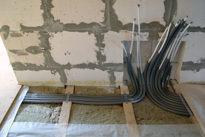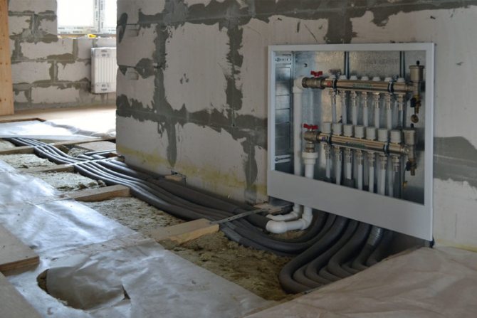 L'installation du revêtement de sol à eau commence à partir des murs, où la place pour le collecteur est préparée. Tout d'abord, un évidement est pratiqué dans la surface du mur, où il est prévu de placer l'armoire collectrice de l'appareil. Il crée une connexion système pratique et une utilisation pratique. Il est souvent installé dans des chaufferies ou des locaux où se trouve le plancher chauffant lui-même.