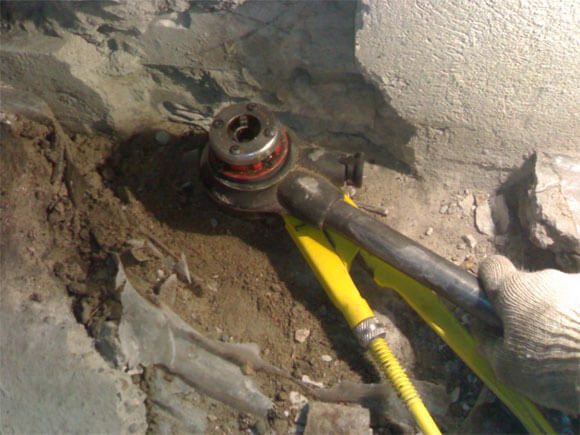 - Après avoir coupé le premier fil, vous devez tenir la colonne montante avec une clé à gaz. La force maximale est appliquée de sorte qu'il soit possible de compenser le moment de rotation de la matrice, car sinon, il sera possible de dénuder les filets de la colonne montante un étage au-dessus ou en dessous.