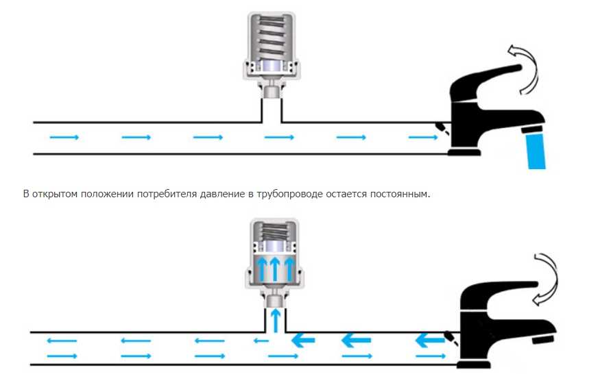 Tant que la pression dans le système ne dépasse pas la pression dans cette partie du réservoir, rien ne se passe. Lorsqu'un coup de bélier se produit, la membrane s'étire sous l'influence de l'augmentation de la pression, une partie du liquide pénètre dans le réservoir. Au fur et à mesure qu'elle se normalise, la membrane élastique a tendance à revenir à son état normal, repoussant le fluide dans le système. Ainsi, le saut est lissé.