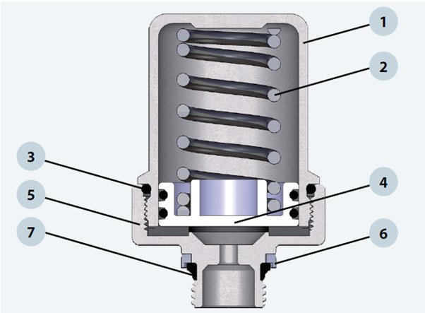 La surpression est soulagée par une chambre à air et un ressort en acier reliés à un double disque en plastique scellé, qui absorbent la majeure partie de la surpression.