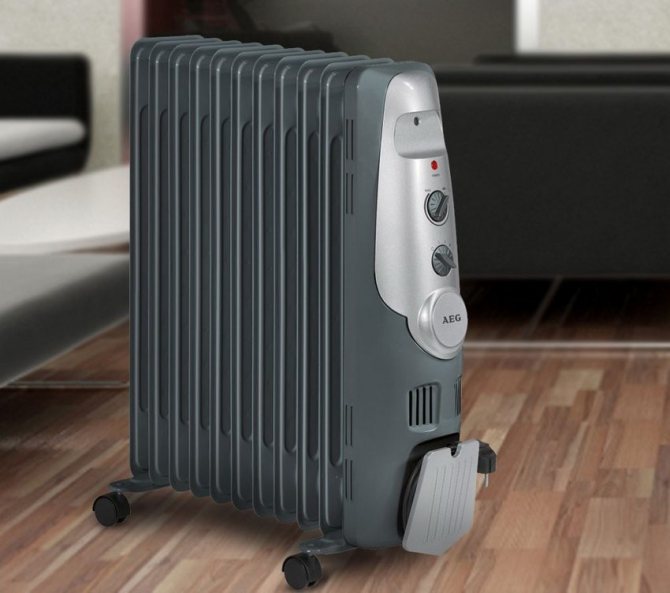 Un grand radiateur électrique au fioul a une puissance élevée de 2500 W, 11 sections et un radiateur soufflant, grâce auquel l'air se réchauffe assez rapidement. Après l'avoir éteint, il reste chaud pendant longtemps et garde la pièce au chaud. Le fonctionnement de l'appareil est régulé mécaniquement.