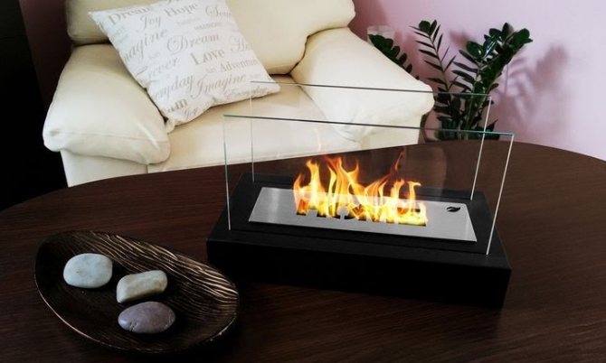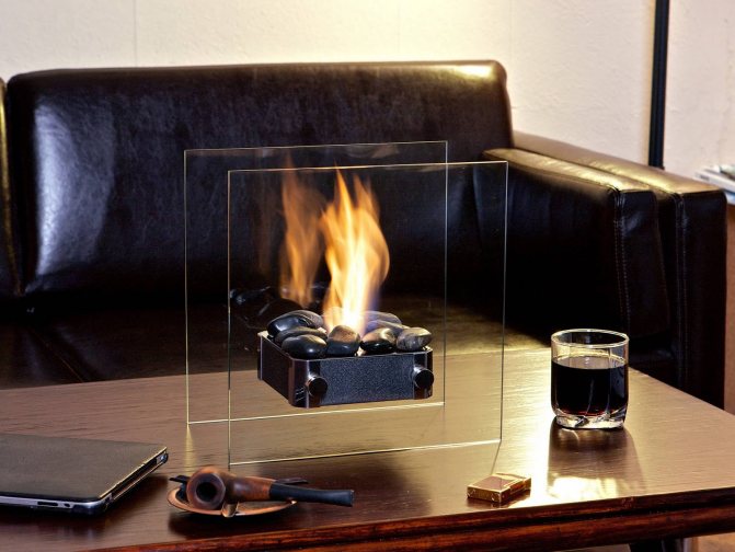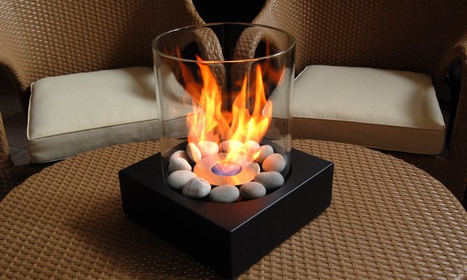 - Dessus de la table. On les appelle aussi «bougies bio». Ce sont des structures miniatures faciles à transporter d'un endroit à l'autre. Les cheminées biologiques de bureau peuvent être de n'importe quelle forme - rectangulaire, ovale, cylindrique ou bol. La plupart des modèles sont en outre protégés par du verre de 2 ou 4 côtés.