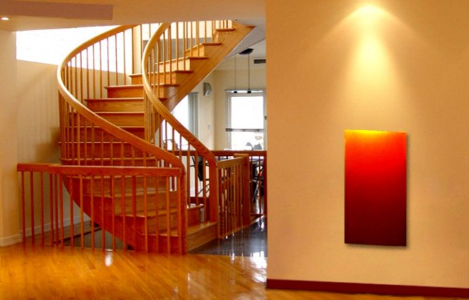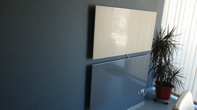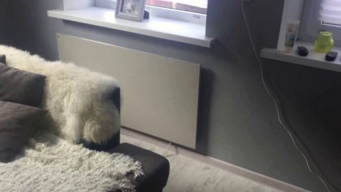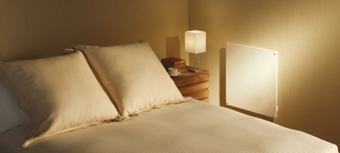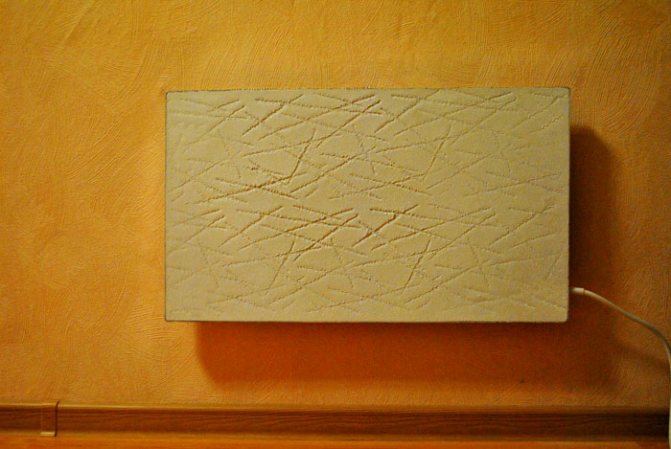 En raison du chauffage, l'élément chauffant génère des anions, qui équilibrent l'atmosphère de la pièce chauffée et en précipitent également la poussière. Les radiateurs muraux infrarouges sont légers. Et la surface du panneau chauffant chauffe jusqu'à un maximum de 80 ° C. Ainsi, le radiateur ne brûle pas d'oxygène. Mais en raison de la température suffisamment élevée, un tel appareil de chauffage doit être recouvert d'un écran de protection ou suspendu à une hauteur sûre.