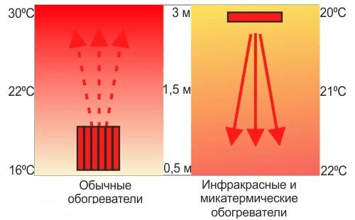 Le principe de base du fonctionnement d'un radiateur infrarouge est basé sur le rayonnement dans le spectre infrarouge. Les objets environnants sont chauffés par l'influence de rayons dans une plage invisible pour l'homme et dégagent de la chaleur dans l'air.