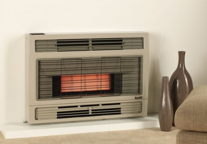 - Chauffage infrarouge. La base de l'appareil est un brûleur infrarouge. Elle a reçu une telle épithète pour le fait qu'une surface en céramique chauffée par une flamme émet un rayonnement infrarouge. Les corps environnants dans la pièce absorbent ce rayonnement, chauffent et chauffent l'air. Cette méthode de transmission d'énergie est considérée comme efficace pour les petits et les grands locaux.Une grande variété de formes de corps d'appareils vous permet de choisir parmi des modèles muraux, muraux et intégrés. Mais toute utilisation de feu ouvert entraîne la combustion inévitable de l'oxygène. Par conséquent, il est nécessaire de ventiler la pièce le plus souvent possible ou d'installer un conduit de ventilation.