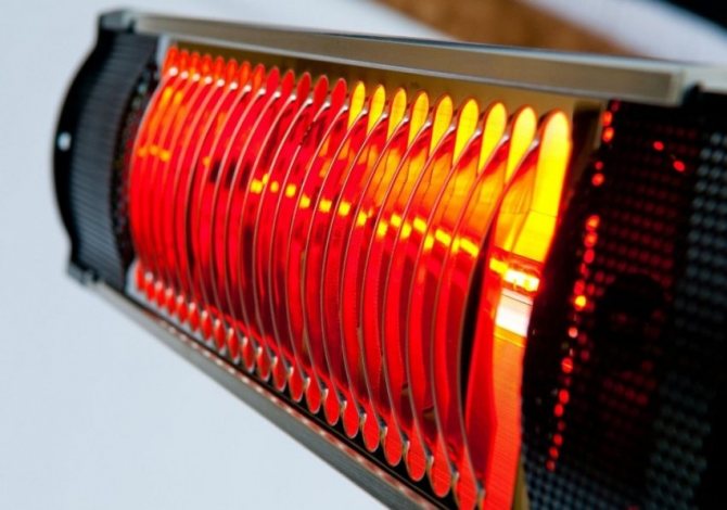 - Le principe de fonctionnement des radiateurs infrarouges. À l'intérieur du corps, il y a des brûleurs avec des émetteurs en métal ou en céramique. Lorsqu'ils sont chauffés, ils commencent à émettre de la chaleur - des ondes infrarouges. Ceux-ci, à leur tour, ne chauffent pas l'air, mais des objets situés à une certaine distance de la source de chaleur. De tels appareils, en fonction de la puissance, sont capables de chauffer de grandes pièces et même des espaces ouverts.