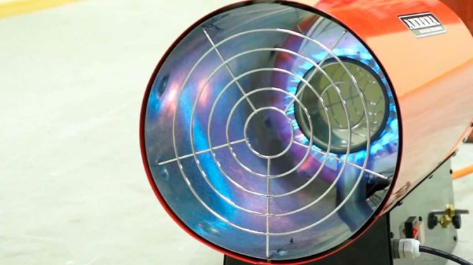 - Canon à gaz. Un autre type de chauffage est un canon. Un puissant flux d'air soufflant sur le générateur de chaleur se réchauffe rapidement et pénètre dans la pièce. Le canon a un niveau de bruit élevé, il est donc utilisé pour chauffer des locaux industriels, des garages et des huttes temporaires. Souvent, un tel dispositif est utilisé lors de la réalisation de travaux de construction en hiver, s'il est nécessaire d'assurer le séchage du matériau de construction. Extérieurement, le pistolet ressemble à un tuyau au bas duquel une unité de commande est installée. Le tuyau contient un brûleur à gaz et un ventilateur. L'unité de contrôle assure l'alimentation en gaz et la régulation de son alimentation.