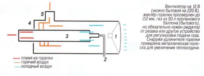 Insérez le briquet dans le trou, ouvrez le gaz, mettez le feu, obtenez le briquet, allumez le ventilateur. Les produits de combustion entrent dans fait sauter un poêle à bois, fabriqué à partir d'une bouteille de gaz vide. De plus, tout est enlevé à l'aide d'une cheminée vers l'extérieur. L'air chaud entre par le tuyau latéral de l'échangeur de chaleur. Les bouteilles de gaz domestique sont utilisées pour 50 litres. L'alimentation en gaz est régulée par un régulateur, qui est installé après le réducteur standard. Consommation approximative de gaz - 15 litres pour la période automne-hiver. Température de l'air intérieur - 18 ° C Le canon à gaz est pratique, utile et mobile.