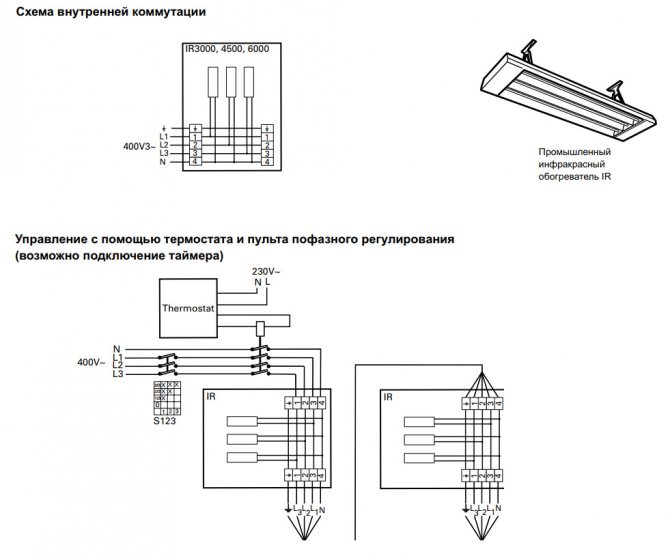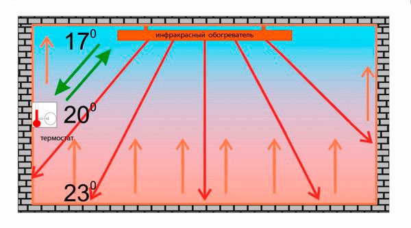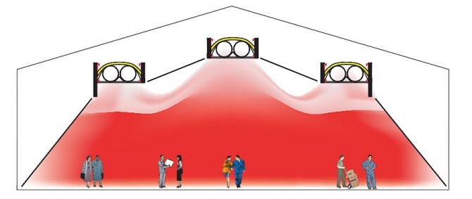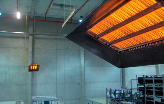 - Les émetteurs infrarouges sont connectés au secteur et commencent à générer un rayonnement infrarouge (ou le produisent en raison de la combustion de gaz naturel ou liquéfié), et en très grande quantité - vous devez vous rappeler le volume des locaux industriels;