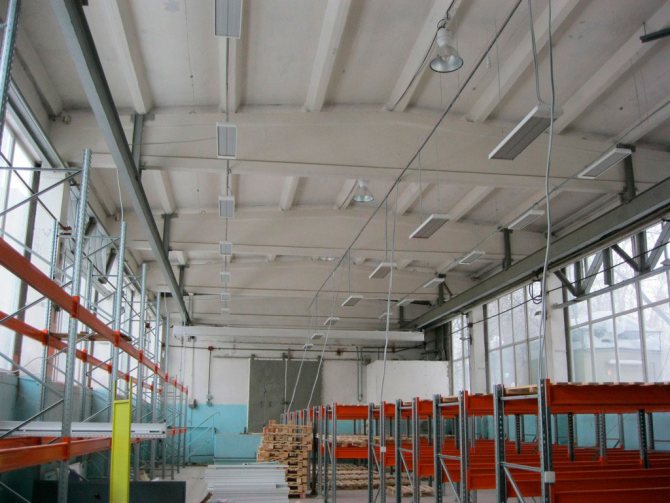 - La possibilité de travailler dans des pièces avec de hauts plafonds - les radiateurs infrarouges industriels chauffent de haut en bas. Suspendus au plafond ou par des câbles, ils envoient un rayonnement infrarouge aux consommateurs;