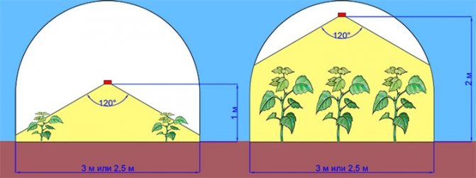 La distance entre les plantes et la source de chaleur ne doit pas être inférieure à 1 m. Ceci est particulièrement important lors de l'installation d'un appareil de chauffage puissant, car les plantes peuvent simplement «brûler». Habituellement, cette distance est choisie empiriquement et est maintenue à mesure que les plantes poussent en ajustant la hauteur de l'appareil.