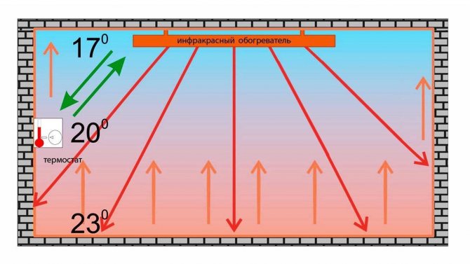 Les rayons infrarouges sont des ondes électromagnétiques du spectre correspondant. Lorsqu'un chauffage infrarouge fonctionne dans une serre, l'énergie de ces ondes est transférée aux objets tombant dans la zone de rayonnement - plantes, sol et autres.En eux, il est converti en chaleur, dégagée dans l'air. Ainsi, sa température ne monte pas tant à partir du dispositif de chauffage, mais à partir d'objets chauffés, ce qui est extrêmement efficace et économique.