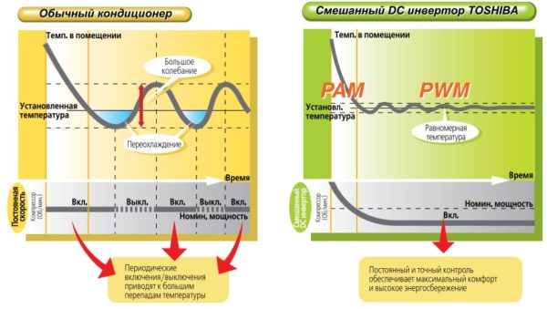 Ce type d'appareil possède un onduleur intégré qui convertit le courant alternatif en courant continu, tout en modifiant la tension et la fréquence. En physique, ce processus est appelé inversion. Les appareils décrits sont des alternateurs à tension périodique. Leur forme est proche d'un signal discret ou sinusoïde. Ce processus affecte considérablement la puissance de l'unité. Pour cette raison, les appareils électriques pendant le fonctionnement sont silencieux et efficaces.
