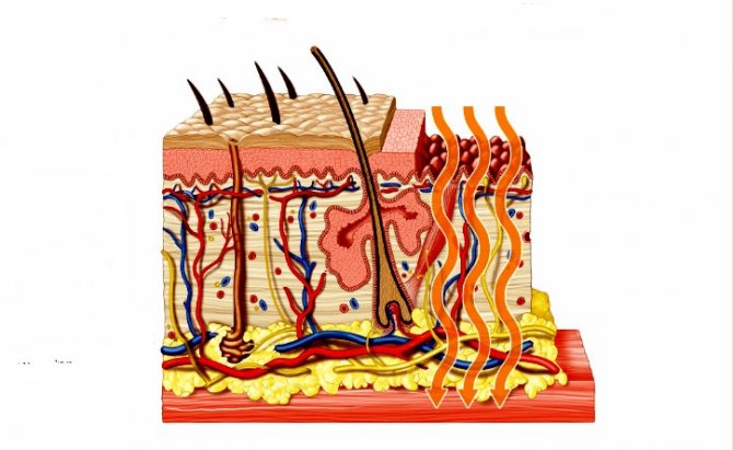 - Génération de chaleur absorbée par les tissus. Une partie de cette chaleur est dissipée dans l'environnement, tandis que le reste est transféré aux tissus profonds.