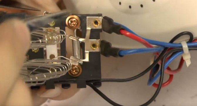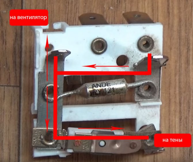 En l'allumant, nous connectons soit un dix dans la chaîne, soit nous utilisons deux spirales à la fois. Il s'avère qu'une phase est fournie au fusible et que le zéro est appliqué aux contacts situés au verso via l'interrupteur. Ou vice versa, selon la façon dont vous avez branché la fiche dans la prise.