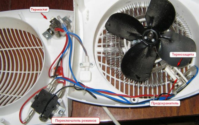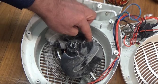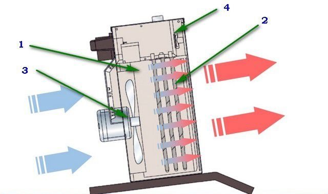 - Souffleur d'air (item 3). Le ventilateur lui-même agit comme cet élément, grâce auquel l'air froid de la pièce pénètre dans l'élément chauffant et, lorsqu'il est chauffé, retourne dans la pièce.
