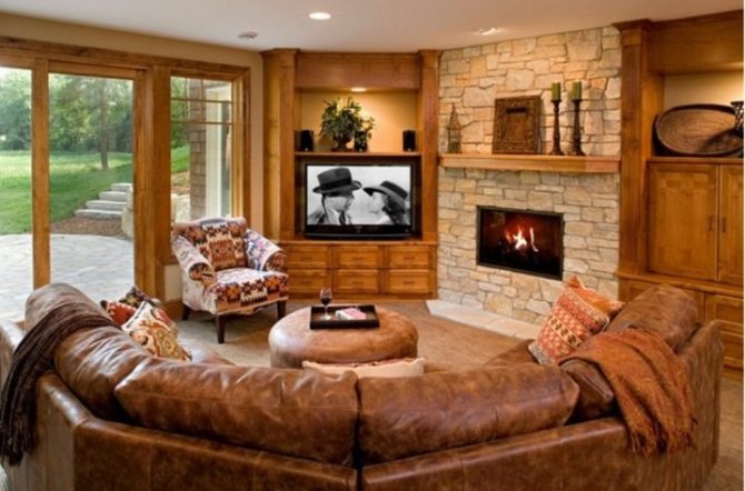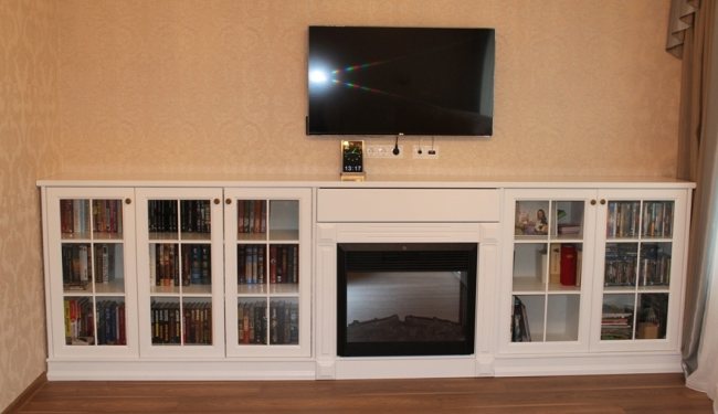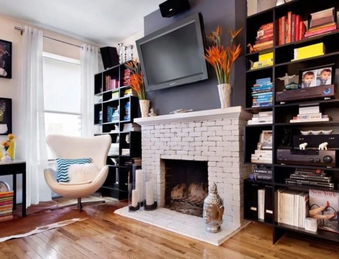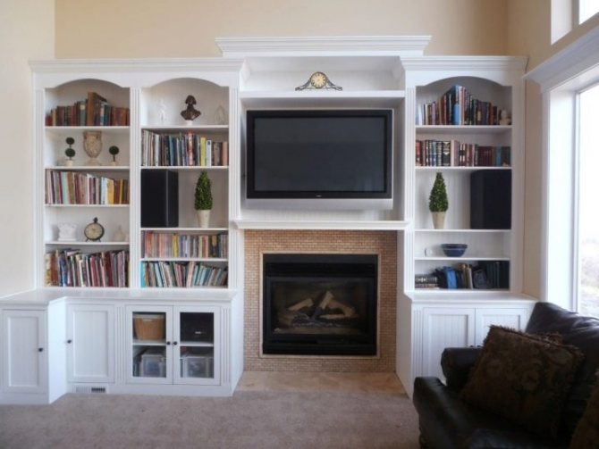 L'utilisation de rayonnages. Une grande étagère est réservée au téléviseur, la cheminée est encastrée dans le mur et est ombragée d'une teinte beige. En raison du mobilier, la composition semble appropriée et harmonieuse.