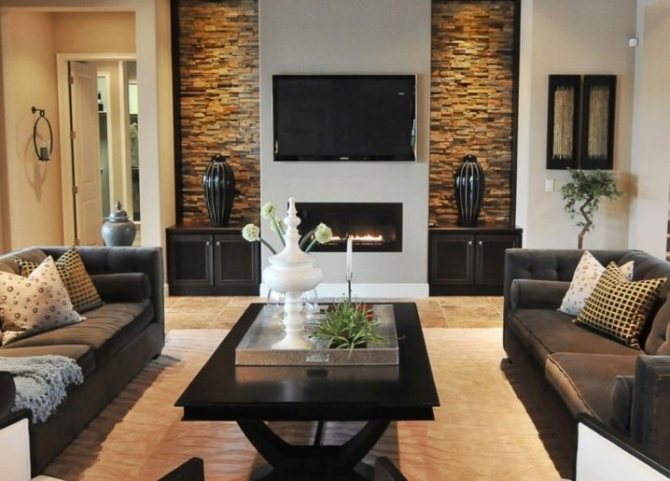 Un exemple complexe mais réussi de combinaison de deux accents: le placement d'une télévision avec une étagère au-dessus de la cheminée avec des portes, combiné avec la maçonnerie de la partie inférieure du rebord de la cheminée.