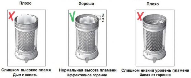 Lorsque le processus de formation d'une flamme sur la mèche a lieu, la lumière doit être "séparée" au moyen d'une coquille ou d'une maille, en conséquence, elle commencera à regarder un peu. Afin d'atteindre cette position de travail, après avoir allumé la mèche, il est nécessaire d'utiliser un bouton spécial pour régler correctement le niveau de flamme.