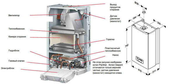 Par exemple, une chaudière appelée Panther est idéale pour chauffer et obtenir de l'eau chaude dans une petite maison, dans une maison de campagne et même dans un garage. Il ne nécessite pas de cheminée séparée car il dispose d'une sortie coaxiale intégrée pour l'élimination des produits de combustion.