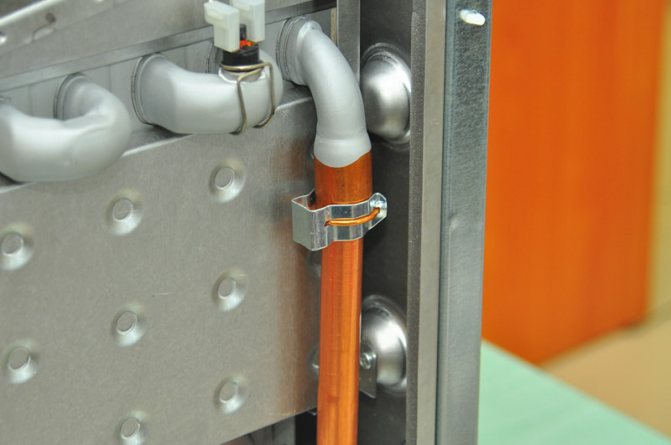 Toutes les connexions sont effectuées sur des colliers et uniquement à partir de tuyaux en cuivre. Le capteur de température est situé en haut de la photo.