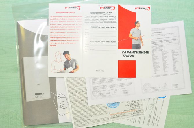 Un paquet de documents pour l'achat d'une chaudière à gaz Protherm Lynx 24 1. Passeport de la chaudière 2. Carte de garantie 3. Certificat de conformité 4. Acte de délimitation des frontières 5. Contrat de maintenance (service) 6. Reçu de vente