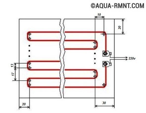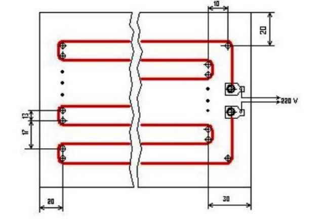 Après cela, des rivets métalliques sont insérés dans les trous et enroulés à l'extrémité du matériau en fil. L'essentiel est de calculer le fil afin de tout réparer correctement. Nous le réparons avec des rondelles, il est très important que le fil ne se détache pas. C'est ainsi qu'un appareil de chauffage fait maison est créé.
