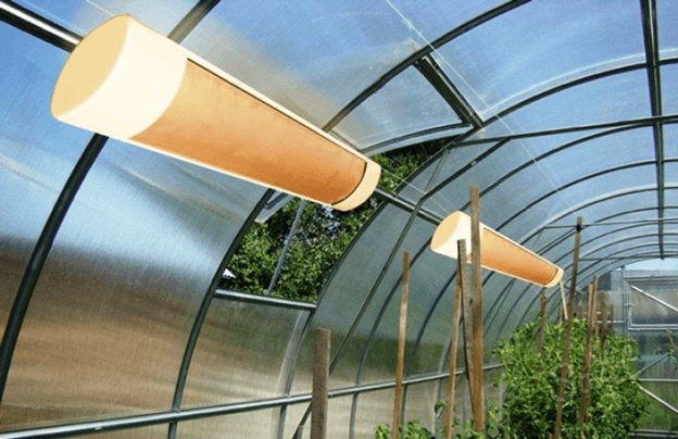 Faisceaux de lampe infrarouge sont comme la lumière du soleil. Le rayonnement généré par le dispositif de commande chauffe le sol et les plantes elles-mêmes. Des radiateurs ou des films IR sont placés sous le plafond de la serre. Pour les serres, des émetteurs infrarouges à ondes longues sont souvent utilisés. Ce type de chauffage est utilisé si la température extérieure ne descend pas à des valeurs extrêmes.